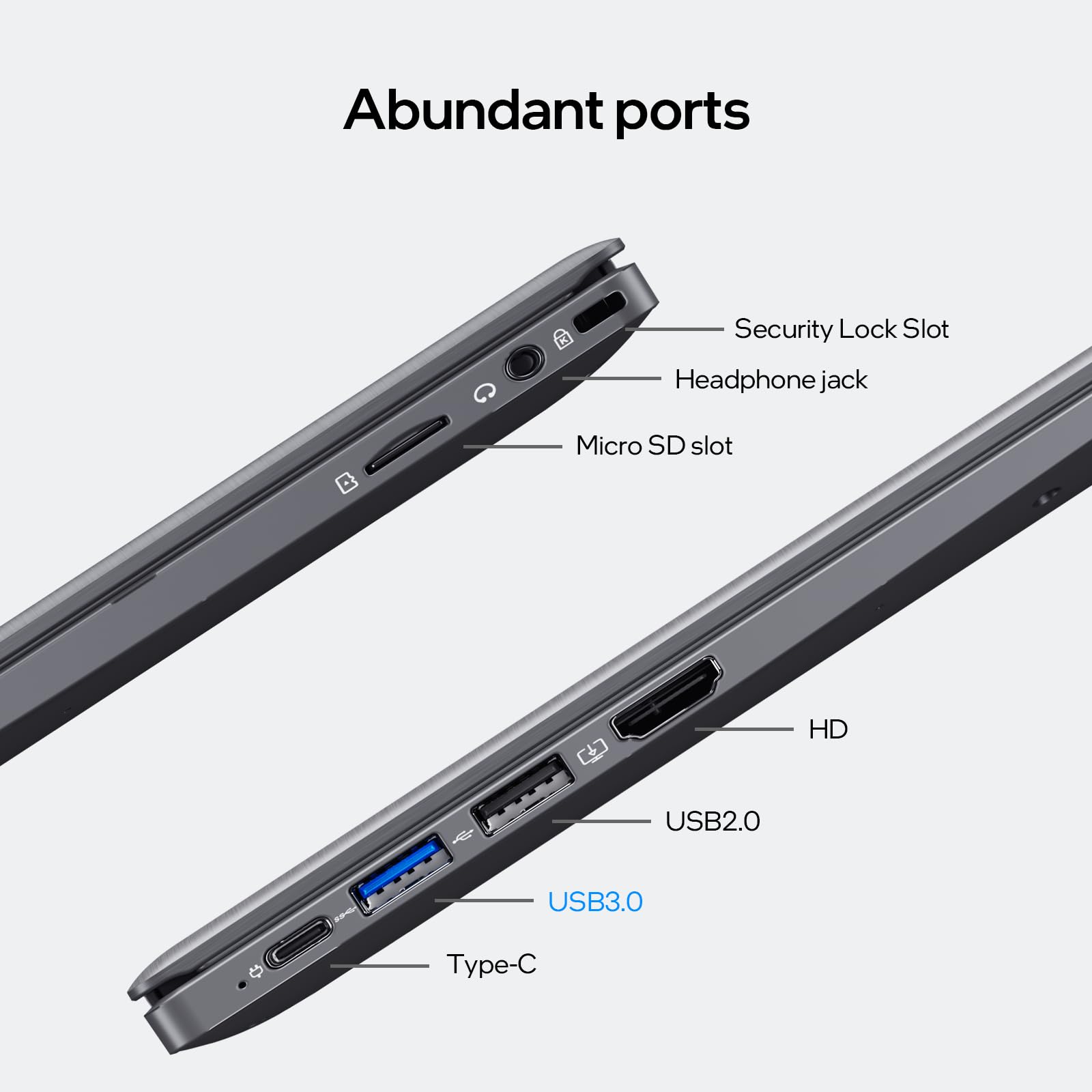 - Versatile Connectivity Hub: Connect with ease to all your peripherals and devices. Our laptop features a comprehensive port selection including 1x USB 3.0, 1x USB 2.0, Standard Size HDMI, Headphone Jack, and Micro SD Card Reader, ensuring maximum compatibility and flexibility.